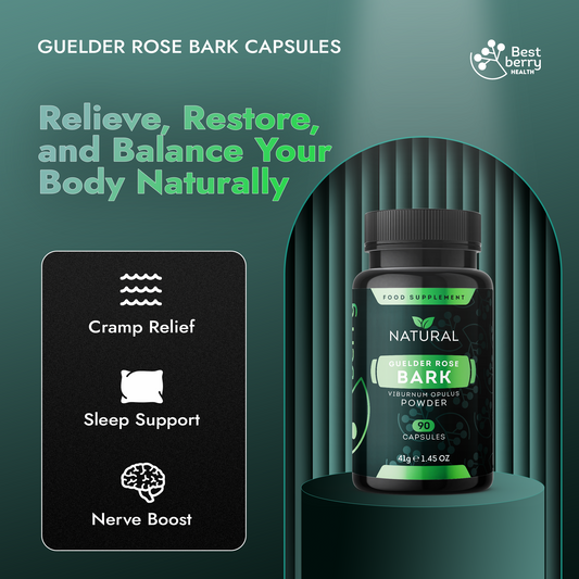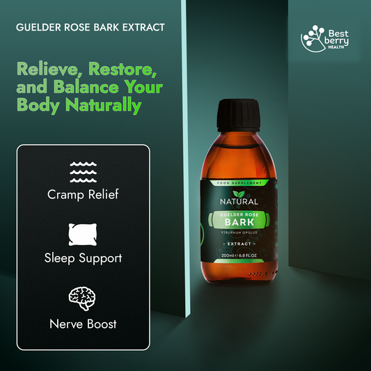 Our Guelder Rose Bark Extract food supplement offers natural relief, calming tension, restoring balance, and promoting restful sleep and vitality.